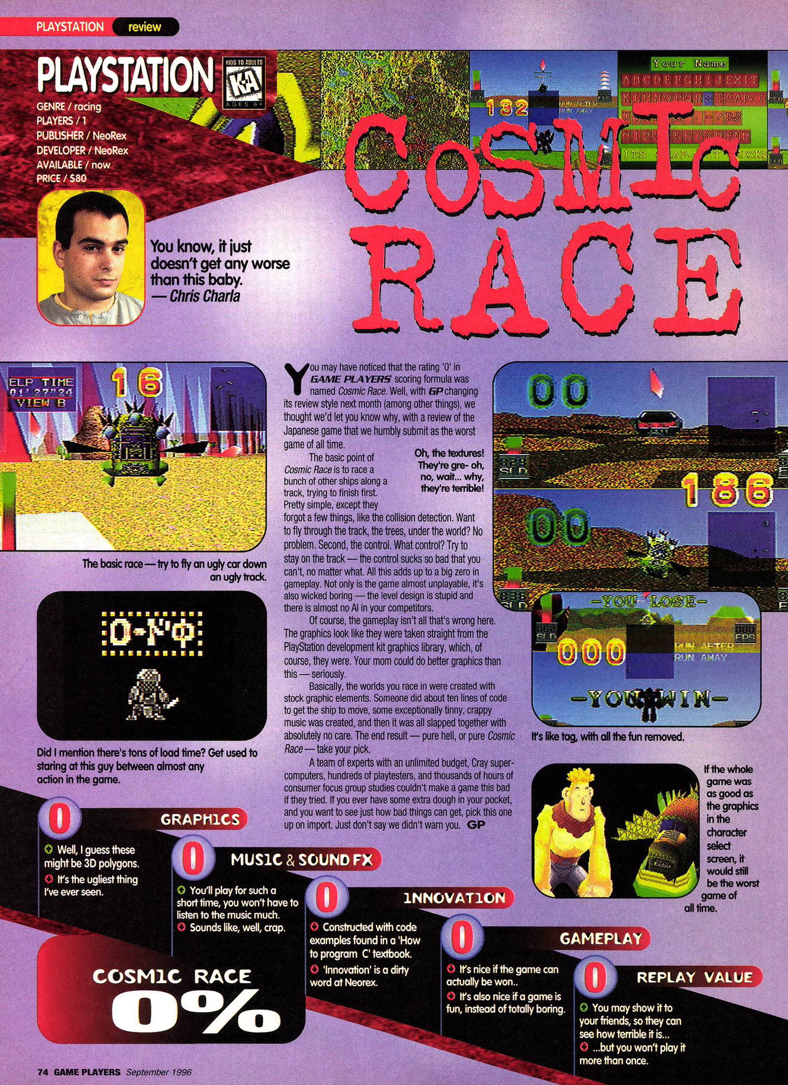Cosmic Race is an early PlayStation racing game released exclusively in Japan, notable for receiving intensely negative reception from many reviewers.